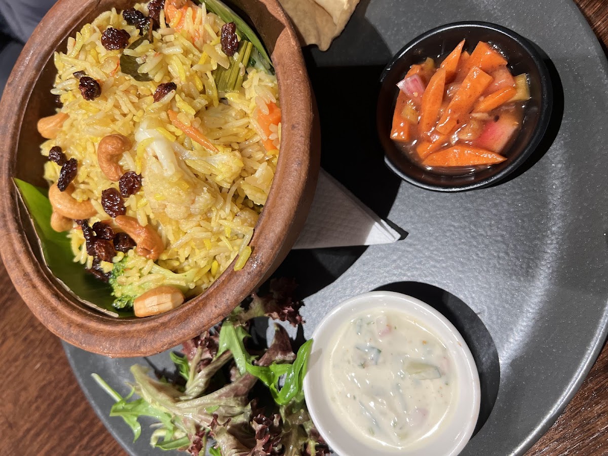 Another highlight from the menu is the Coconut Roti & Fish Curry, which brings together soft, lightly toasted roti infused with coconut and a bold, savory curry. The roti itself has a subtle sweetness that pairs beautifully with the spices of the fish. For diners looking for something filling yet aromatic, the Vegetable Biryani is a great choice. The rice is layered with vegetables and spices, delivering a dish that’s vibrant, satisfying, and perfect for lunch.