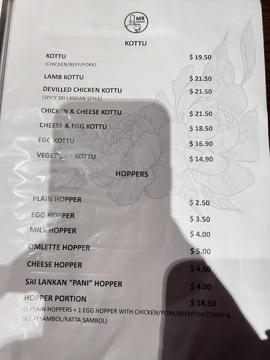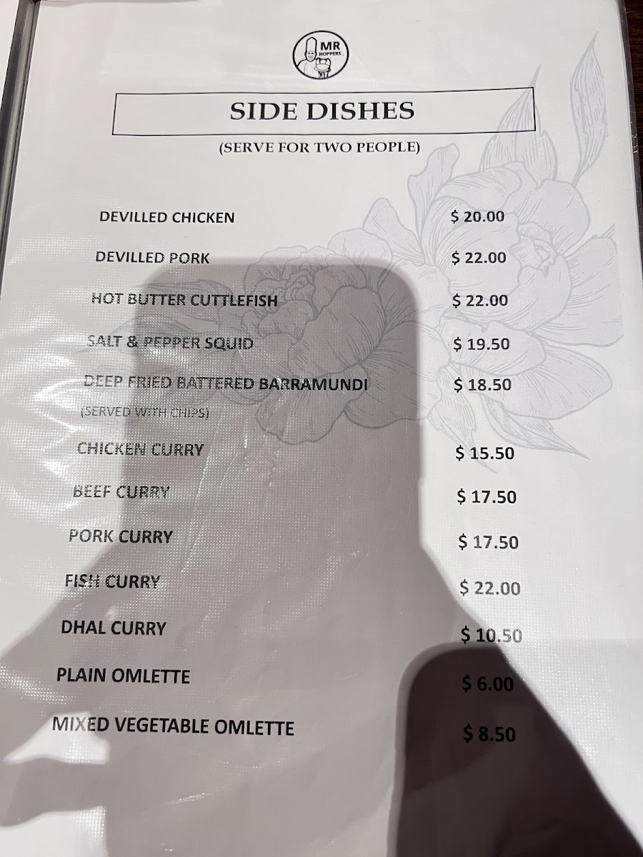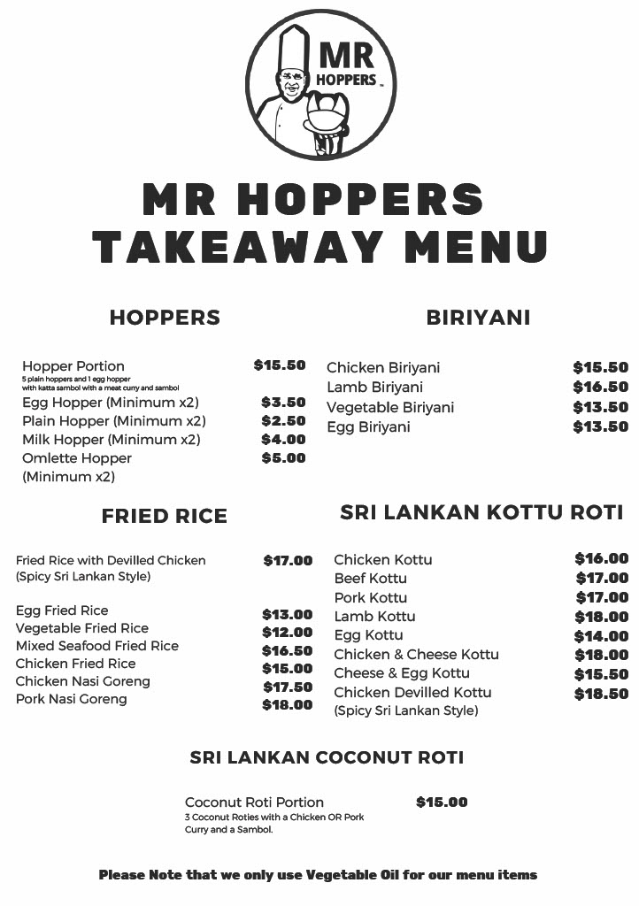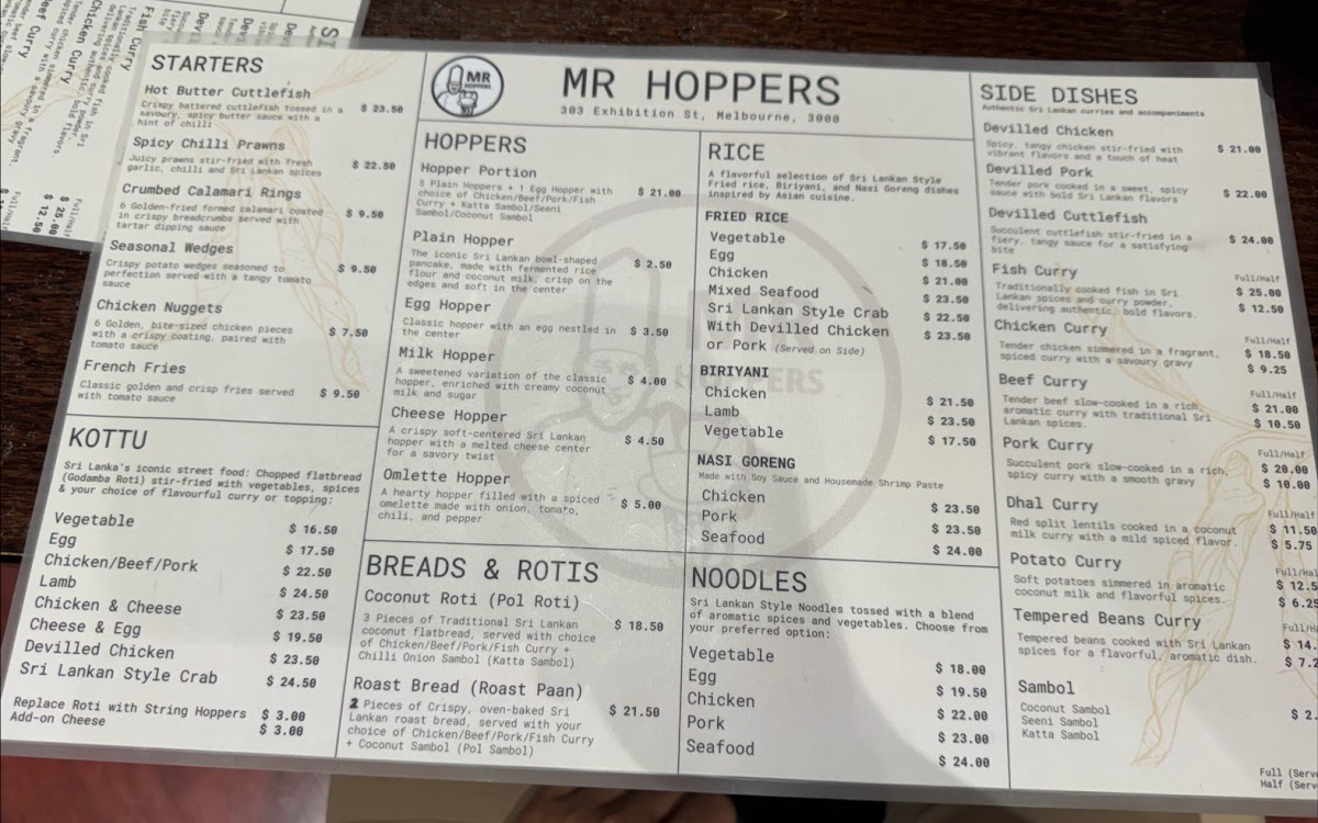 The menu at Mr Hoppers offers a delightful blend of traditional Sri Lankan flavors with an innovative twist, showcasing dishes that are both hearty and flavorful. The standout dish, Hoppers with Fish Curry, is a must-try, featuring perfectly crispy hoppers paired with a rich and aromatic fish curry. For those seeking a flavorful vegetarian option, the Vegetable Biryani impresses with its fragrant rice and fresh, vibrant vegetables. The Chicken Kothu Parotta is another highlight, a satisfying and savory dish made with shredded parotta, chicken, and a medley of spices that come together in a mouthwatering combination. The Coconut Roti & Fish Curry offers a unique pairing of soft, coconut-infused roti with a flavorful fish curry, making for a comforting meal. If you're craving a lighter bite, the Coconut Roti Portion serves as a great accompaniment, with its slightly crispy exterior and soft, chewy interior. Lastly, the Chicken Deviled is a standout for those who enjoy a touch of spice, with tender chicken pieces coated in a tangy and flavorful sauce. With each dish offering its own distinct taste and experience, Mr Hoppers provides an exceptional culinary journey that perfectly captures the essence of Sri Lankan cuisine.