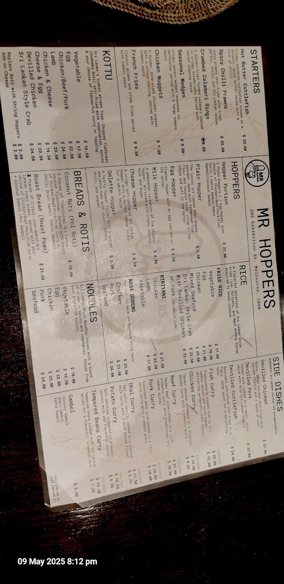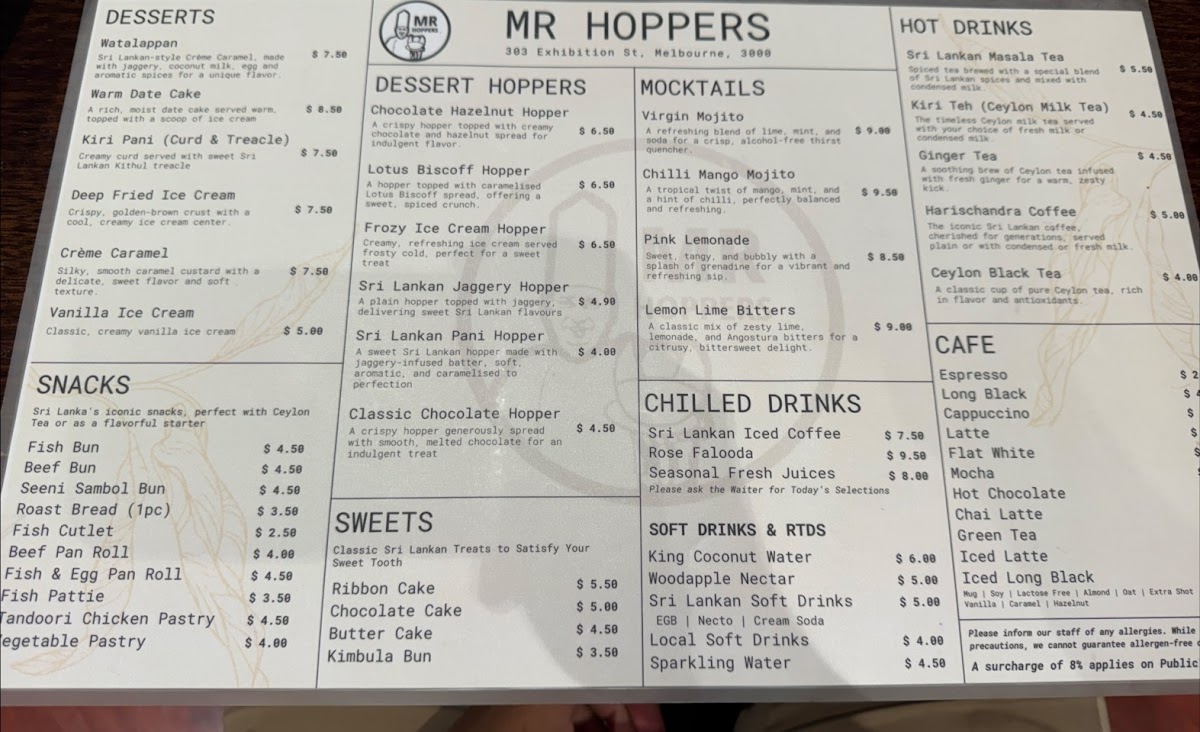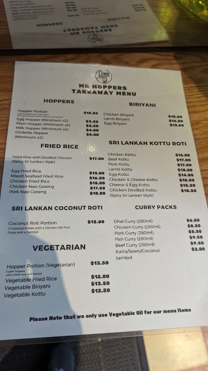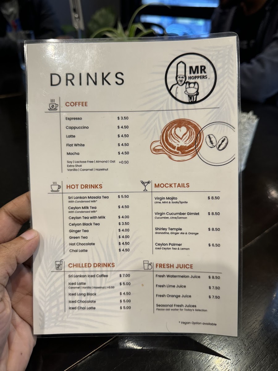 The menu at Mr Hoppers offers a delightful blend of traditional Sri Lankan flavors with an innovative twist, showcasing dishes that are both hearty and flavorful. The standout dish, Hoppers with Fish Curry, is a must-try, featuring perfectly crispy hoppers paired with a rich and aromatic fish curry. For those seeking a flavorful vegetarian option, the Vegetable Biryani impresses with its fragrant rice and fresh, vibrant vegetables. The Chicken Kothu Parotta is another highlight, a satisfying and savory dish made with shredded parotta, chicken, and a medley of spices that come together in a mouthwatering combination. The Coconut Roti & Fish Curry offers a unique pairing of soft, coconut-infused roti with a flavorful fish curry, making for a comforting meal. If you're craving a lighter bite, the Coconut Roti Portion serves as a great accompaniment, with its slightly crispy exterior and soft, chewy interior. Lastly, the Chicken Deviled is a standout for those who enjoy a touch of spice, with tender chicken pieces coated in a tangy and flavorful sauce. With each dish offering its own distinct taste and experience, Mr Hoppers provides an exceptional culinary journey that perfectly captures the essence of Sri Lankan cuisine.